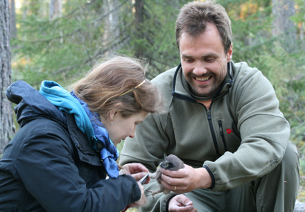 Harri toimitti ystävällisesti rengastustilanteesta hauskan kuvan. Poikasista vanhin on juuri saamassa jalkaansa alumiinisen renkaan yksilöllisellä tunnistenumerolla.