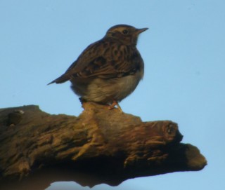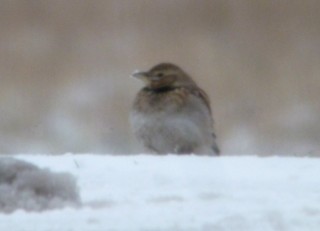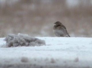 14.2. herätyskello soi aikaisin ja aamuseitsemän aikaan pihaan saapui Tom Nordblad kyydissään Jari Laitasalo sekä Pasi Pirinen. Vesisateisessa kelissä nousin kyytiin ja lähdimme ajamaan kohti Varsinais-Suomea. Matka meni mukavasti rupatellessa ja yhdeksän aikaan saavuimme Maskun Laulaisiin, josta olikin jo hyvissä ajoin tullut tieto, että kohdelajimme oli yhä paikalla. Käveltyämme tien laidassa ryhmänä seisseen bongarijoukon luo, löysimmekin helposti noin 70 metrin päässä tien toisessa reunassa ruokailleen arokiurun! Tämä jo muutamia päiviä paikalla ollut Suomen 12. lajinsa edustaja seisoskeli lumisella tienpenkalla ja käveli aika ajoin sulammalle tien reunalle kaivamaan jotain evästä lumen alta. Ohiajaneet autot eivät sitä pahemmin haitanneet, erästä rekkaakin se väisti aikalailla viime tingassa ensin kovaa juosten ja sitten tien reunalle lennähtäen.
