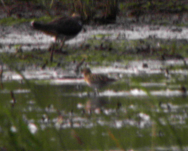 Aamulla 28.8. heräsin klo 4.45, soin aamiaisen ja lähdin taas kohti Laajalahtea, jossa oli hieman ennen kuutta. Autoja oli paikalla jo aivan liikaa, joten pelkäsin, että joutuisin taas ruovikkoon jonottamaan. Onneksi kuitenkin vielä juuri ja juuri mahdoin torniin takariviin, josta ei kuitenkaan juuri pystynyt lietettä havainnoimaan. Mutta mikäli lintu löytyisi, olisi minulla ainakin hyvät mahdollisuudet sen näkemiseen. Alkuun lietteiltä löytyi mm. vesipääsky, kuovisirri sekä pari suo- ja pikkusirriä ja nämä onnistuin kaikki näkemään. Klo 6:25 Mika Bruun sitten löysi suippopyrstösirrin ja silloin alkoi tornissa melkoinen kuhina! Linnun nuotitus oli arvatenkin vaikeaa, mutta olisin uskonut, että eturivin äärimmäisen kokenut bongarikaarti olisi hieman parempaankin pystynyt! Niinpä itsellänikin meni ainakin 5 minuuttia ennen kuin löysin linnun ja muutamilla muilla vielä paljon tätäkin kauemmin! Lopulta mahdutin itseni tornin takaosan penkille, josta pystyin katsomaan lintua muiden yli ja pääsin näkemään sen ihan kohtuullisen hyvin, vaikka lintu olikin todella kaukana lietteen takaosassa. Päätin kuitenkin pian tehdä jonottajille tilaa ja poistua tornista. Tietysti tulisin paikalle vielä myöhemmin katsomaan lintua paremmin. Pikku porukalla kävimme ensin yrittämässä näkyisikö lintu pitkosten varteen lahden pohjukasta, mutta sinne näkyi vain metsäviklo. Mutta Konemiehetien päästä onnistuimme Jörgen Palmgrenin, Andreas Uppstun, Ilkka Sahin ja Sampsan kanssa löytää linnun. Pian se kuitenkin lennähti taas katveeseen, joten jonon perältä singahtaneet eivät lintua löytäneet. Pikkuhiljaa kuitenkin torniin alkoi tulla tilaa ja kaikki pääsivät linnun näkemään.