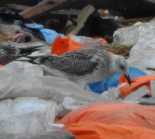 Me päätimme jatkaa retkeä ja suuntasimme seuraavaksi Helsingin Niskalan pelloille yrittämään punakaulahanhea, mutta sitä ei valkkariparvista löytynyt. Lapinkirvinen lensi ylitsemme äännellen ja kuovi kierteli pelloilla. Sitten olimme jo suuntaamassa Vuosaaren kasalle töyhtökiurua bongaamaan ja lyhyelle staijille, kun tuli tieto, että Ämmässuon kaatiksella oli taas etelänharmaalokki samalla paikalla kuin viikkoa aiemmin. Niinpä suuntasimmekin sinne, olihan kyseessä reissun eka elis Sampsalle! Aika pian pääsimme paikalle ja siinähän lokki seisoi, täsmälleen samassa kohdassa kuin missä olin nähnyt sen viimeksikin. Opiskelimme lintu jonkin aikaa, kunnes saimme tiedon, että kipillä katsottiin parhaillaan aroharmaalokkia. Muut jatkoivat kippiä kohti kävellen aidan viertä (kaatopaikka-alueellehan ei ole mitään asiaa), mutta me päätimme ajaa toiselle puolelle kaatista, josta paikalle olisi hieman lyhyempi kävely. Pienen hortoilun jälkeen löysimme oikean reitin, mutta lopulta olisimme olleet nopeammin perillä toista kautta. Nyt kuitenkin oli lyhyempi matka autolle, kun olisimme lähdössä pois. Se ei kuitenkaan kauheasti lämmittänyt, sillä nyt myöhästyimme hetken, sillä lähes kaikki lokit olivat juuri lähteneet kipiltä. Niinpä jäimme paikalle tuijottamaan lokkeja ja niitähän riitti! Jonkun ajan päästä A. Uppstu huomasi paikalle siirtyneen etelänharmaalokin, jota oli nyt mukava seurata hieman aktiivisempanakin. Pian saimme alueen sisäpuolella olevilta lokkilaskijoilta (joilla siis on lupa alueella liikkua), että aroharmaalokki oli lennossa täytekasojen päällä. Sieltä emme lintu löytäneet, mutta pian lintu löytyi kipiltä muiden seasta! Parhaimmillaan saimme nauttia aro- ja etelänharmaalokista jopa samassa putken kuvassa!