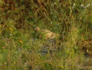 1.8. lähdimme ani varhain retkelle Dani Burgaksen kanssa. Suuntana oli tietysti Lappeenranta ja Toikansuo, jossa arokyyhky oli yhä paikallisena, mutta matkan varrella oli tarkoitus myös pysähdellä. Joutsenon peltoaukeilla oli kuitenkin aamuyöstä todella hiljaista! Ei edes ruisrääkkää enää kuulunut, viiriäisistä puhumattakaan. Kotasaaressa vallitsi sankka sumu, mutta 80 kurkea, 4 pikkutylliä ja mustaviklo sentään nähtiin. Lopulta jatkoimme aamun valjettua Toikansuolle, jossa oli jo paikalla muitakin elis- ja kk-pinnabongareita. Arvata saattoi, että arokyyhky piilotteli taas tuttuun tapaan ruderaatissa Toikansuon täyttömäellä kuten muulloinkin silloin, kun se ei ollut altailla. Toista tuntia tihrustimme sankkaan kasvustoon ja yritimme nähdä lintua edes vilaukselta. Pensassirkkalintu lauloi pätkittäin ja viitakerttusperhe touhusi aktiivisena vieressämme. Lopulta Henrik Lindholm löysi arokyyhkyn liikkumasta verkkaisesti kasvien keskellä. Pian lintu otti siivet alleen ja lensi komeasti ylitsemme äännellen kohti altaita. Kiiruhdimme altaille, mutta löysimme sieltä vain 4 pikkutylliä, 7 lapinsirriä, kuovisirrin sekä suosirrin ja 2 metsävikloa ym. Satakieli varoitteli vieressämme ja luhtakerttunen lauloi lyhyesti omituista syyslaulun tapaista, mutta arokyyhky pysyi piilossa. Olimme kuitenkin varmoja, että se oli yhä altailla – katveessa vain taka-altailla. Niinpä päätimmekin lähteä etsimään lähistöllä yhä majaillutta töyhtökiurua. Pian saimmekin tiedon, että tehtyään laajan lentokierroksen, oli arokyyhky taas palannut altaille näkyviin.