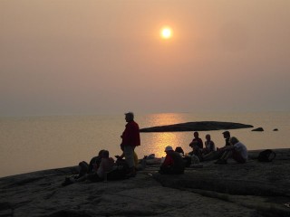 Lopulta hommat saatiin paahtavasta helteestä huolimatta kutakuinkin valmiiksi iltapäivään mennessä ja roudasimme taas kaikki tavarat rantaan ja jäimme odottelemaan venekyytiämme. Kiihtynyt tuuli kuitenkin esti kumivenettä saapumasta rantaan, joten Metsähallituksen väki sai viedä meidät muutama kerrallaan kumiveneelle ennen kuin pääsimme paluumatkalle. Kyyti oli taas yhtä vauhdikasta kuin tullessakin, mutta sentään pari ruokkia ja yksi riskilä nähtiin. Sapokassa hörppäsimme ansaitut kylmät juomat ja söimme jäätelöt ennen kuin kykenimme lähtemään kotia kohti.