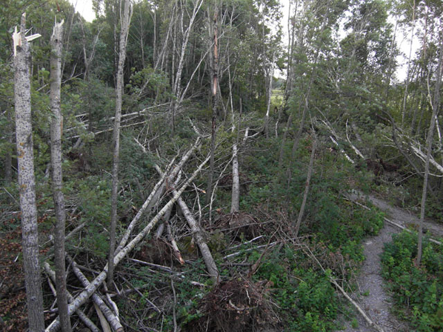 9.8. kävimme Hannan ja Ala-Kojolan Mikon kanssa iltakäynnillä Siikalahdella kauhistelemassa ja kuvaamassa myrskyjen tuhoja. Uuden lintutornin viereinen haavikko oli lähes kokonaan nurin ja muuallakin oli puita nurin runsaasti, onneksi rakenteet olivat säilyneet ehjinä. Polku tietenkin oli täysin tukossa kymmenien kaatuneiden puiden takia. Pikkusieppo rätisi mukavana havaintona polun varren yhä pystyssä olleiden puiden latvustossa.