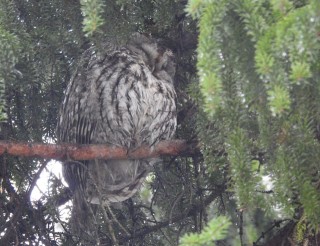 Soon it was snowing again so we decided to continue towards Helsinki. We went to one garden where we had got information that there was already Tawny Owl youngsters outside their nest-hole. After we had seen some Fieldfares and a Treecreeper we met a kind photographer who showed us all 3 youngsters but also an adult owl. They were all sleeping on the trees and they looked very pathetic in this wet weather.