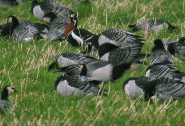 At the evening it happened. I got the message that in Kitee 60 kilometres north was a Red-breasted Goose in a flock of 900 Barnacles! And of course it was a Sunday night and too late! At Monday I was very nervous at work and finally I managed to leave to Kitee little earlier with two twitchers from Helsinki. And the goose was still there when we got there. It was feeding and sleeping in the middle of a flock, and it was very difficult to see. But I managed to get some photographs of it. But two days later everything changed black! Some birders managed to see that the bird had a red ring on its leg, so might not be a countable bird at all.