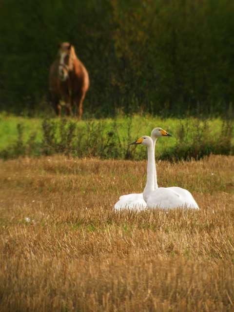 On the 28th of September I went to Siikalahti in afternoon. There were nice flocks of Whooper Swans and Cranes on the fields. In total of 160 Cranes and 70 Swans were feeding on a field and I managed to get pretty close to photograph them. I also saw a family of Cranes. The young birds had rings on their legs! The birds that we had ringed with Pirkka were still there! I also saw a flock of 130 Barnacle Geese and some Bean Geese.