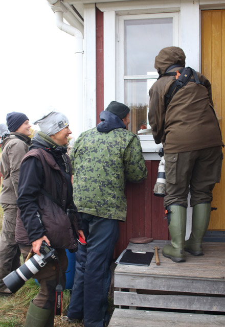 Once the migration-watch was stopped when Jyrki called that he had a Bullfinch with white on its tail-feathers on his hand. We of course went to see this so called Trumpeter or Komi Bullfinch that are rarely seen but more often heard in Finland during some autumns.