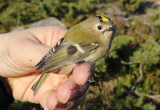 When Jyrki and Lotta had already closed their mist-nets, we had still many tits hanging on our nets. So with help of them we finally got all the nets empty and closed and at 2 p.m. Hanna had finally ringed all the birds. During the day we had ringed altogether 305 birds which 2/3 had been in pine-forest. The most common species had been a Goldcrest 84, Treecreeper 72, Great Tit 49, Robin 28, Blue Tit 22 and Wren 21. 18 Long-tailed Tits were ringed and other better birds were 3 Coal Tits, 1 Brambling and 4 Bullfinches which 2 of them were again eastern Bullfinches with white spots on their tail.