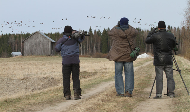 It was again a cold night but anyway I biked to Siikalahti after 4 a.m. On the way I heard a Wren and a Coal Tit and a Savi’s Warbler from the dam-road. Soon I met with the rest of the team Hanna, Pirkka, “Allu”, Jari Kiljunen, Matti Lötjönen and Ilpo Kuusisalo and soon we were walking towards the bird-tower. It took again some time to make everything ready in the tower and soon it was 5 a.m. and the race started and only 11 seconds after 5 a male Garganey flew in front of the tower. Soon we had seen all the ducks that included some good ones like Slavonian Grebes, Smews, Pintails, Shovelers and of course Gadwalls. Chaffinches and thrushes were migrating in good numbers so soon we had seen also a Brambling and all 5 thrushes. Black Grouses were displaying, a Water Rail was heard once, 2 Great Spotted Woodpeckers were seen and several Bitters heard. While I was watching only to the sky the rest of our team were also checking the fields, bushes and reedbeds – but also watching to the sky. 8 Black-throated and 2 Red-throated divers, 3 Hobbies, a Little Ringed Plover, 10 Whimbrels, 5 Spotted Redshanks, 5 Lesser Black-backed Gulls, a Cuckoo, 2 Sand Martins, a Waxwing and 2 Whinchat were good. Even Jay was easy this year. At 8:24 a.m. a Marsh Sandpiper flew over us and continued towards south and at 8:34 I found a Black Kite migrating towards north. Then we hadn’t got many species before at 10:36 we heard a familiar call and found a caller flying over us – a female Citrine Wagtail!