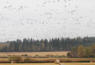 Jyrkilän pelloilta löytyi noin 400 kurkea, 123 laulujoutsenen parvi mukanaan yksi pikkujoutsen sekä jopa 1100 valkoposkihanhea. Metsähanhia ei ollut kuin kymmenkunta mutta muutama parvi lensi taas ylitsemme, valkoposkiakin näkyi muutolla jokunen parvi. Sinisuohaukka saalisteli peltoa edestakaisin lennellen.