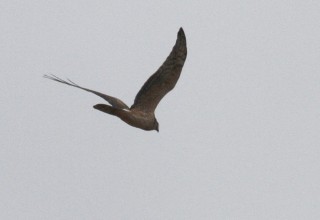 Ratilassa, Pohjasuolla ja Pohjanrannassa oli hiljaista, mutta Jyrkilästä löytyi noin 2000 valkoposkihanhen parvi. Ollessamme taas autossa, plokkasin ylitsemme lentämästä siron näköisen suohaukan. Olimme pian ulkona ja saimme linnun määritettyä naaras arosuohaukaksi. Hanna sai pari kuvaakin otettua jo aika kaukana suoraan poispäin, kohti länttä jatkaneesta linnusta.