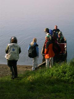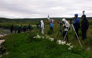 Meillä oli kuitenkin jo kiirus Vardöseen (Vuoreija), jossa ajoimme suoraan satamaan ja pian ensimmäiset olivat jo paattimatkalla kohti Hornöyan lintusaarta. Lopulta meitä kyyditsi kaksi venettä, kalastuspaatti ja moottoroitu kumivene. Ainakin jälkimmäisessä matkustaneet saivat hieman kostean reissun, mutta jo matka paljasti kurssilaisille millaiseen lintuparatiisiin olimme matkalla. Riskilöitä, lunneja, ruokkeja ja kiisloja suhahteli veneen molemmin puolin, ja saaren lähestyessä uivia ruokkilintuja oli satamäärin. Rantauduttuamme lintusaaren jyrkät lintuja täynnä olevat rinteet salpauttivat takuulla hengityksen kaikilta (eikä syynä ollut kaikkialla pöllynneet lintujen höyhenet).