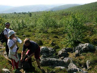 23.7. käytyämme aamiaisella lähdimme kohti etelää pysähtyen Inarissa karhunpesänkivellä sekä Kaunispäällä, jossa sai joko komppailla tuulessa ja tuiskussa tai jatkaa suoraan Saariselälle shoppailemaan ennen ruokailua. Innokkaimmat komppaajat onnistuivat näkemään rinteen alas kavuttuaan mm. kuukkeleita ja pohjantikkaperheen.