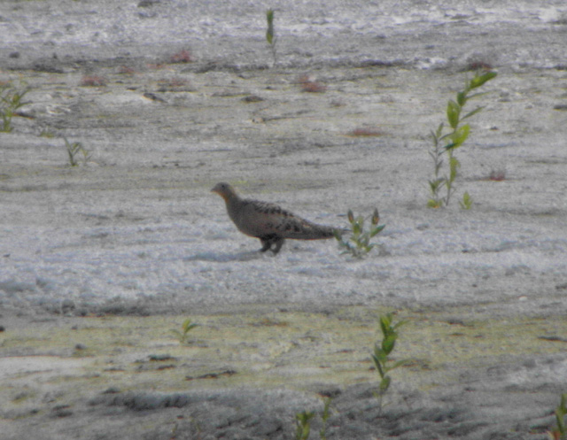 29.7. rysähti sitten vielä kovempaa! Päivän kovin uutinen ei ollut se, että Liperissä mitattiin historialliset 37,2 lämpöastetta, vaan se että Matti Vanhapelto löysi Lappeenrannan Toikansuolta AROKYYHKYN! Ehdin käydä pikaisesti paikalla jo hylsyämässä ja järjestämässä bongausta ilmoittaen ajo-ohjeita ja antaen muita neuvoja ja ohjeita bongauksen toimivuuden turvaamiseksi. Lintu kyllä oli yhä paikalla, se oli löytynyt Askolan altailta, josta se oli äännellen siirtynyt Toikansuon mäelle, jonka ruderaatissa se piilotteli, mutta tietenkään ei ollut järkeä lähteä komppaamaan, kun tulijoita oli vielä matkalla muutama sata muukin. Lopulta ankean odottavan työpäivän jälkeen lähdimme Hannan kanssa uudelleen paikalle. Lintu onneksi yhä tiiviisti kähmyili ruderaatissa siten, että vasta muutama kymmentä bongaria oli sen nähnyt. Lintu oli ollut useamman tunnin taas piilossa mäen kasvillisuuden seassa, kun saavuimme paikalle ja moni kuumuuden uuvuttava bongari oli juuri lähdössä hakemaan juomista ja hieman huilaamaan, sillä mäelläkin oltiin 34,5 asteen varjolämpötilassa, joten paahteessa oli kuin saunassa. Ehdimme juuri ja juuri moikata muutamaa tuttua, kun huomasimme linnun lennossa mäen oikealla puolella! Arokyyhky lensi ohitsemme ja katosi pajujen taakse kohti altaita. Niinpä singahdimme paikalle, josta altaille näkyi, mutta paikalla olleet bongarit eivät olleet lintua nähneet. Onneksi kohta lintu löytyi lennosta altaiden päältä ja pian se laskeutui altaille lokkien ja töyhtöhyyppien ihmeteltäväksi. Pian se yritti käydä juomassakin, mutta lokit eivät antaneet sen juoda rauhassa, niinpä se siirtyi ruokailemaan ja lepäilemään keskelle allasta, jossa se oli hallinnassa muutaman tunnin ajan. Kertaalleen se teki pitemmän lentokierroksen ja pelkäsimme jo linnun lähtevän, mutta onneksi se kuitenkin palasi altaille. Ilta oli jo pitkällä, kun se lensi taka-altaille katveeseen, joten päätimme mekin juomisten jo ajat sitten loputtua lähteä matkaan kohti kotia. Käsittämättömän upea elis ja WP-pinna ja jo kolmas Etelä-Karjalalle uusi laji lyhyen ajan sisään oli tosiasia! Muita mäeltä havaittuja lintuja olivat mm. ainakin 600 tervapääskyä, luhta- ja viitakerttunen, 3 mustavikloa, 4 pikkutylliä, 9 nuorta pikkulokkia, 245 naurulokkia jne. Kilometrin päässä kävimme vielä bongaamassa töyhtökiurun, joka oli pitkän tauon jälkeen löytynyt taas samasta paikasta, josta itse sen löysin.