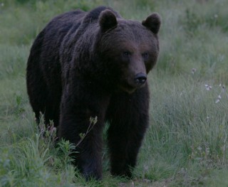 Kojussa oli todella kuuma ja seuraavat tunnit saimme taas seurata, kuinka korpit ja lokit vähensivät jo vähiin käyvää lihavarastoa edustaltamme. Pelkäsimme jo, että koko touhu olisi pian siinä, kun mitään ei meinannut tapahtua! Lopulta klo 22.00 aivan yhtäkkiä ihan eteemme tupsahti jostain todella komea karhu! Otus saapui varovaisesti mutta varsin suoraviivaisesti eteemme, josta se alkoi kaivaa ison tukin alle piilotettuja ruokiaan. Se touhusi pitkään alle kymmenen metrin etäisyydellä meistä, kunnes se lopulta hiippaili takaisin metsään saapuen kuitenkin kohta vielä uudelleen samaan paikkaan hakemaan lisää evästä. Reilun puolen tunnin episodi oli upeaa katsottavaa, mutta lopulta nalle katosi sinne mistä oli tullutkin.