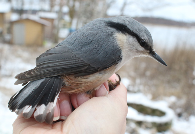 Parikkalassa Itsenäisyyspäivää viettänyt Hanna rengasti jätärin nakkelin. Tämä lintu sai keltaisen ja punaisen värirenkaan.