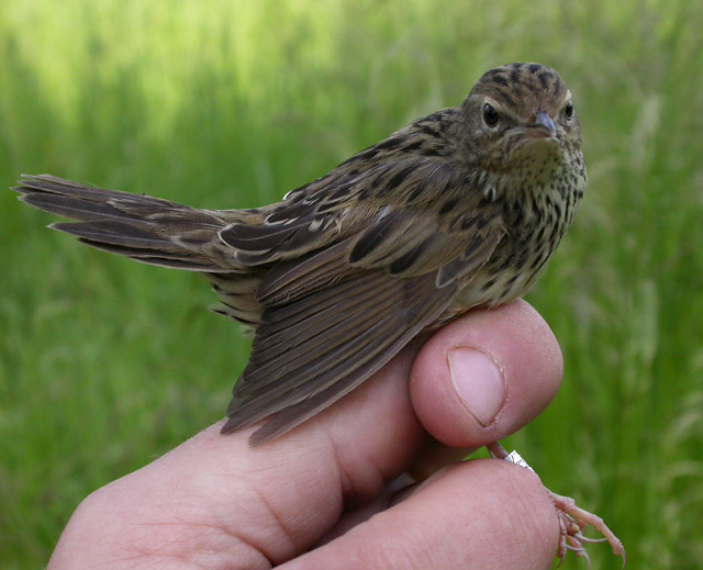 Seuraavana aamuna teimme molemmat taas kartoituslaskentaa (Hanna nyt Konzan alueella, kun tämä oli Venäjällä), mutta mitään erikoista ei löytynyt. Laskennan päätteeksi kävimme rengastamassa viirusirkkalinnun. Erikoinen lintu muuten, sujahti kolmeen kertaan verkosta läpi ennen kuin jäi kiinni – ja kaikki tämä noin 30 sekuntia siitä, kun verkko oli pystyssä ja atrappi päällä!