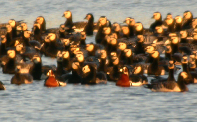 8.10. oli hanhilla kova muutto päällä, mutta työpäivän takia en ehtinyt sitä juuri seuraamaan. Ruokatunnilla näkyi kuitenkin n.4000 hanhea, mutta suurin osa hanhista oli tainnut jäädä välille. Niinpä työpäivän jälkeen lähdin Saarelle etsimään hanhimassoja. Jo matkalla ylitseni lensi komea 550 sepelhanhen parvi. Ensimmäinen 400 paikallisen valkoposken parvi löytyi Rautalahdelta, hetken jopa kannattaako näin pienen parven takia pysähtyä, sillä olin juuri Nyströmin Harryn kanssa puhelimessa. Olin yhä Harryn kanssa puhelimessa pystyttäessäni putkeani samalla luuriin manaten, kuinka en koskaan löydä hanhiparvista mitään parempaa, kun katsoin putkeen ja ensimmäinen lintu oli punakaulahanhi! Saatuani selville, ettei linnulla ollut renkaita, olin jo juhlatuulella, kunnes huomasin parvessa myös toisen renkaattoman punakaulahanhen! Linnut olivat selvästi pari, sillä toinen (koiras) oli selvästi paksu- ja punakaulaisempi ja linnut liikkuivat löytöhetken jälkeen koko ajan tiiviisti yhdessä. Parvi oli todella lähellä 6-tietä, joten pari kertaa ne säikähtivät ohi ajanutta rekkaa ja lennähtivät lopulta Rautalahteen kellumaan. Punnosen Pekka oli ainoa paikalle kiiruhtanut bongari, joten pidin lintua hallinnassa toista tuntia, kunnes juuri kun Pekka oli saapumassa paikalle, linnut nousivat taas siivilleen. Onneksi ne laskeutuivat taas 6-tien viereen pellolle ja Pekkakin ehti nähdä linnut hyvin ennen kuin taas yksi rekka säikäytti parven lentoon ja ne lähtivät kohti koillista eikä punakaulahanhia enää tämän jälkeen nähty.