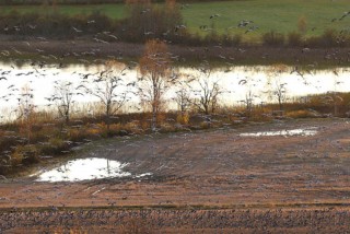 27.10. palattuamme yöllä Englannista ja tehtyäni täyden työpäivän, suuntasin kiireellä bongaamaan Särkisalmelta löytynyttä harjalintua. Onnekseni kymenlaaksolaisbongarit olivat tehneet sinnikkään päivätyön ja sateessa etsiskelleet lintua reilut neljä tuntia ja löytäneet sen juuri sopivasti, kun kurvasin paikalle. Ehdinkin nähdä linnun oikein mukavasti ensin nurmella ja sitten puun oksalla, ennen kuin se lennähti piiloon eikä sitä sen koommin nähty! Viereisellä Huotikkalanpellolla näin elämäni myöhäisimmän valkoposkihanhen – oikeastaan 7500 yksilöä! Seuraavina päivinä niin Huotikkalanpellolla kuin myös Tyrjällä oli molemmissa yhä 5000 valkkaria, Tyrjällä myös 30 tundra- ja 20 metsähanhea. Hanhimylläkät siis näyttivät jatkuvan aina marraskuulle saakka!