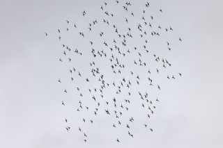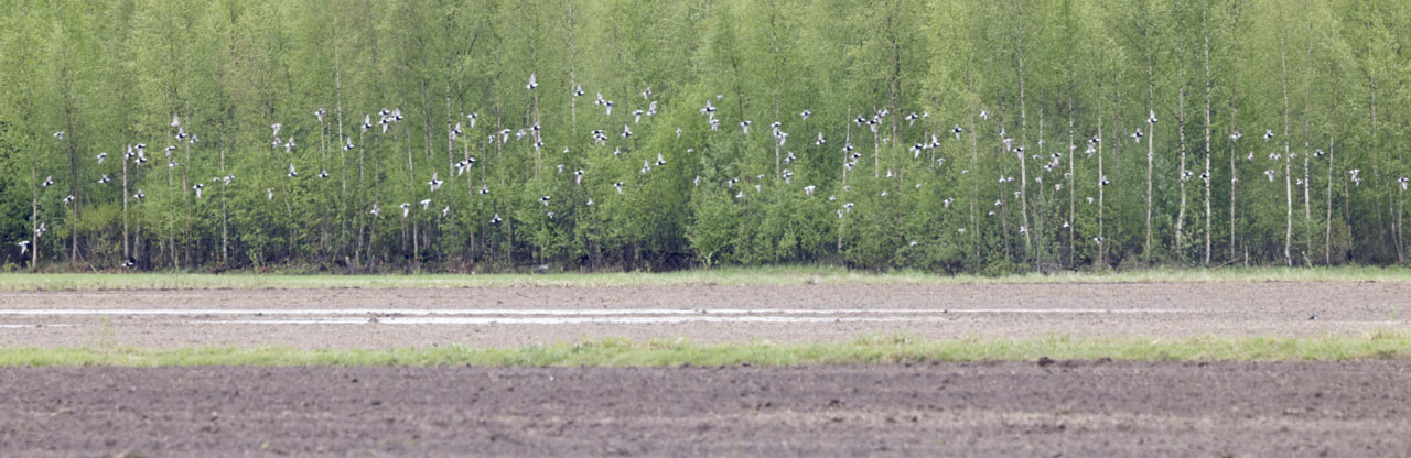 Edellisestä havainnosta oli jo pitkälti yli kuusi tuntia, kun klo 20:34 äkkäsin korkealta taivaalta töyhtöhyyppäparven. Huusin parvesta lähellä seisoneelle oulunseutulaisporukalle ja aloin katsoa lintuja tarkemmin putkella – ja siinähän se suohyyppä oli parven mukana! Taavetin Harri huomasi linnun samaan aikaan ja nuotitimme linnut ensin lähiporukalle ja sitten huusin täysillä linnusta, jotta muutkin altaan ympärille levinneet ornit löytäisivät sen.