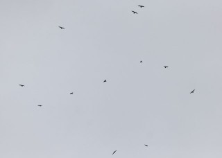 Hyyppäparvi näkyi parhaimmillaan juuri ja juuri paljain silminkin, mutta kiikareilla se löytyi helposti ja suohyyppä erottui 12 töyhtöhyypän seasta helposti. Silti vaikutti siltä, että meistä noin sadan metrin päässä ollut isompi porukka ei meinannut löytää lintua. Huusin lisää ohjeita ja mm. linnun olevan välillä vastarannalla olevan ison tornin (kaivostorni) kanssa samassa putken kuvassakin. Pikkuhiljaa parvi kaarteli taivaalla korkeammalle jatkaen hiljalleen kohti etelää ja lopulta linnut ottivat suunnan SSE ja seurasimme niitä niin kauas kuin putkella näki.