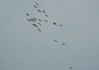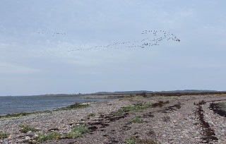 13.10. päästiin taas aamuvakiokin suorittamaan alusta loppuun, mutta merellä oli yhä vain vaisua. Itse olin vaihteeksi aamun verkoilla, kun keli oli kohtuullisen hyvä ja odotukset korkealla. Parissa tunnissa oli kuitenkin selvä, että minua ei verkoilla enää tarvittu, vaikka aamu olikin ollut ihan kohtuullinen: Hippiäinen oli yhä selvä valtalaji 175 rengastuksella. Saaren kierto alkoi mukavasti tutulla taigarautiaisella, mutta oli muuten vaisu, kunnes Etelärannalle päästyämme alkoi näkyä mantereen puolella kohtuullisen voimakasta kurkimuuttoa. Ynnäsimmekin yhteensä 1365 kurkea ja jokunen valkoposkihanhiparvikin näkyi. Lisäksi itse näin maakotkan, joka kuitenkin lähti liitoon ja muut näkivät vain sen loittonevan suoraan poispäin. Tätä uudelleen etsiskellessä löytyi kaukaisuudesta vielä piekanakin. Varislintumuuttokin oli kohtuullista ja näkyipä pari mustavaristakin. Mutta loppusaaren kierto ja puskien kova komppaaminen ei tuottanut mitään mainittavaa.