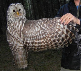 Iltapäivällä kävimme kiertämässä Punkaharjun rajamaastossa sijaitsevat pönttömme, mutta niistäkään ei löytynyt muuta kuin hieman jälkiä, että parissa pöntössä sentään oli joskus pöllö vieraillut. Päätimme vielä käydä rengastamassa yhden uusista viirupöllömammoista. Tämä yksilö tuntui olevan isoin koskaan käsittelemämme viirupöllö – ja äkäinenkin se oli ja vapautettuamme sen se murahteli meille siihen malliin, että jossain lähistöllä meitä tarkkaillut koiraskin innostui huutelemaan meille. Paluumatkalla näin vuoden ensimmäisen nuolihaukkani.