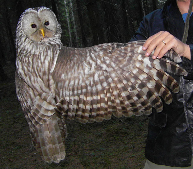 Illalla kävimme rengastamassa toisen uuden viirupöllömme. Tämä olikin helpompi tapaus, sillä se ponkaisi haaviin, kun laitoin sen pöntön suuaukolle hieman kolauttaen. Tämä mamma oli myös selvästä pienempi ja heikompi kuin edellinen, joten rengastuskin sujui oikein mukavasti.
