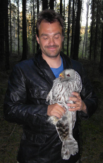 Käytyämme Tarvaslammella uudessa hienossa rantasaunassa, päätimme käydä vielä kontrolloimassa parin vuoden tauon jälkeen vanhimman viirupöllömme. Mutta kuinka ollakaan lintu oli ulkona pöntöstä ja napsui meille vihaisesti ollessamme vasta lähestymässä pönttöä. Kiivetessäni pöntölle alkoi sitten tuttu hyökkäily ja kertaalleen pöllö saikin kunnon osuman sängyn patjalla pehmustettuun kypärääni. Ja niinhän se oli, että pöntössä oli jo pienet poikaset! Niinpä emo jäi kontrolloimatta, mutta saimmepa tiedon, milloin poikaset tulee aikanaan käydä rengastamassa. Ja siitä tulee taas hurjaa, niin äkäinen tämä pöllö on viime vuosina ollut!