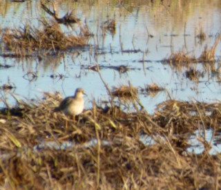 Ehdimme kaikki nähdä linnun hyvin, mutta kohta se nousi lentoon ja näimme siiven alapinnan puolikuukuviotkin. Lintu onneksi laskeutui samaan paikkaan ja tuli jopa hieman lähemmäksikin. Pikkuhiljaa onneksi väreilykin väheni ja lintua päästiin jopa vähän ihailemaankin. Kuvausta ajatellen lintu oli kuitenkin kaukana, joten kuvat jäivät aika heikoiksi.