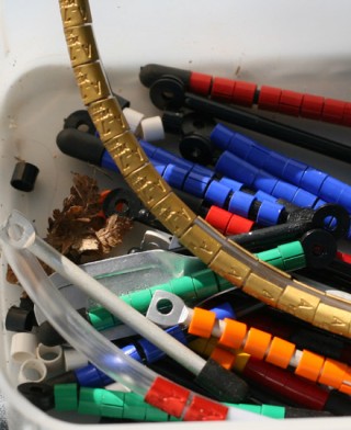 Poikaset laskettiin pussissa narulla Anniinan rengastettaviksi. Jokainen valkoselkätikka saa yksilölliset värirenkaat jalkoihinsa, joista ne voidaan tunnistaa kauempaa kiikarin tai kaukoputken avulla. Toiseen jalkaan tulee värjättyä alumiinia oleva rengas ja toiseen kaksi vuovista rengasta. Renkaat ovat hyvin kevyitä.