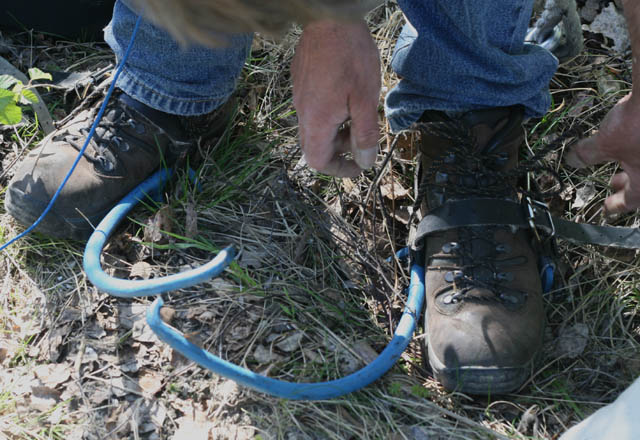 Kimmo kiinnitti tolppakengät vaelluskenkiinsä ja kiipesi pesäpuuhun onkimaan poikaset kolosta. Tälläiseen oksaiseen puuhun kiipeäminen on hidasta, kun turvaköydet on irrotettava vuoron perään jokaisen oksan kohdalla ja siirrettävä oksan yli.