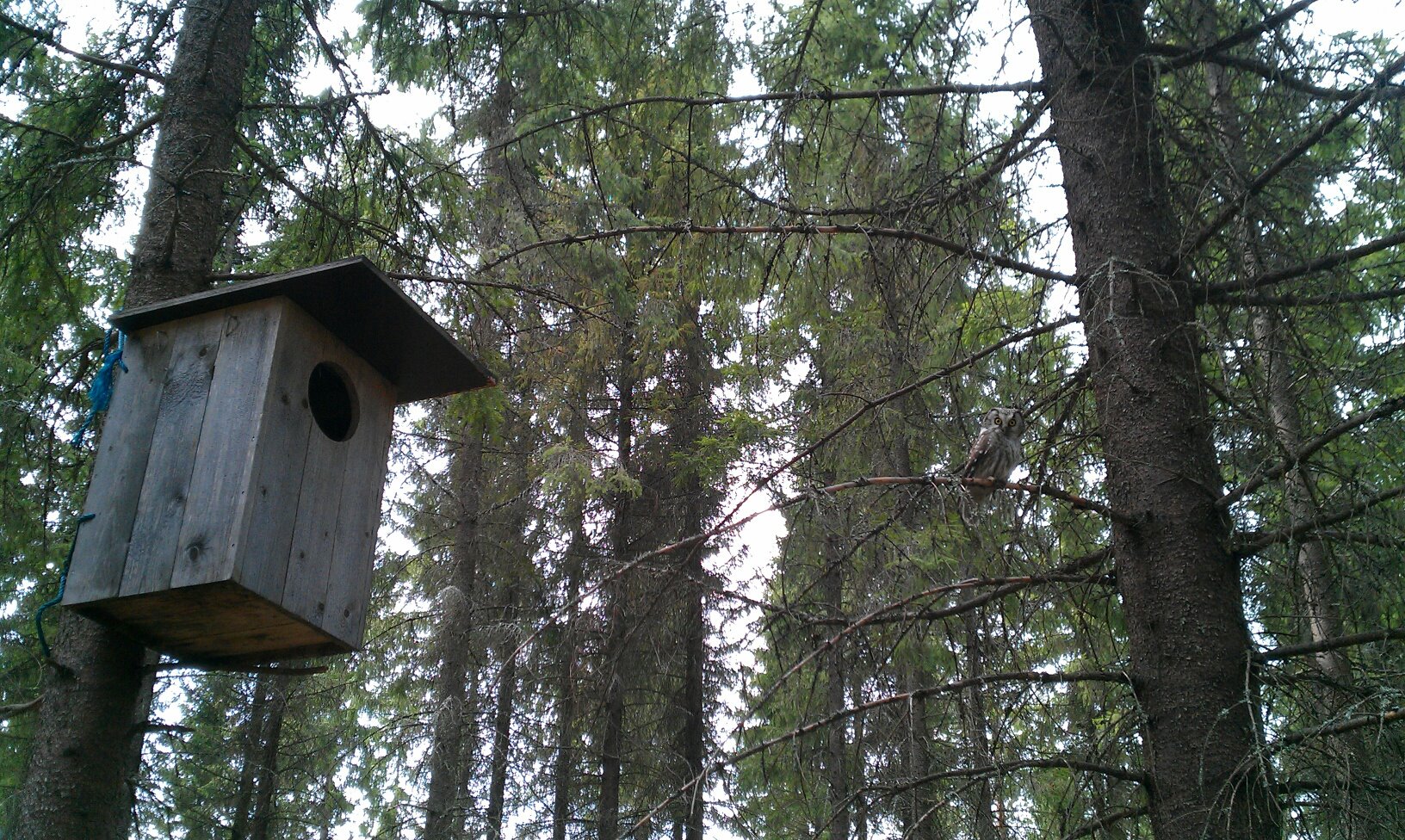 Illalla aloitimme Harrin kanssa pöllönpönttökierroksen ja kävimme tarkistamassa kaikki Tyrjän ja Siikalahden pohjoispuoleiset pöntöt. Pöntöt roikkuivat puissa tyhjyyttään eikä mielialaa lisännyt yksi kokonaan kadonnut pönttö. Kieeroksen päätteeksi kävimme palkitsemassa itsemme varmalla pöllöllä emmekä onneksi joutuneet pettymään, sillä viimeiset kuusi vuotta uskollisesti pesinyt viirupöllömamma hautoi taas kahta munaa perinteisessä pöntössään. Muutama muu pönttö vielä käytiin lähistöltä ja kurvasimme vielä laskemassa viimeisen MAALI-alueeni Tarvaspohjan.