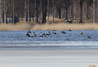 Iltapäivällä suuntasimme Soikkelin Miikan kanssa Saarelle, jossa tietysti poimimme Hannan kyytiin Pohjanrannasta. Linnut olivat kuitenkin ihmeen vähissä! Lopulta näimme Jyrkilässä 5 pikkukuovia ja Suurenjärvenlietteellä punajalkaviklo, mutta emme juuri muuta. Onneksi paluumatkalla stoppasimme kuitenkin taas Särkisalmelle, sillä sulan reunalla nukkui 20 allihaahkan parvi! Kuikkiakin oli jopa 34 lintua, pikkulokkeja 12 ja kalatiiroja 17.