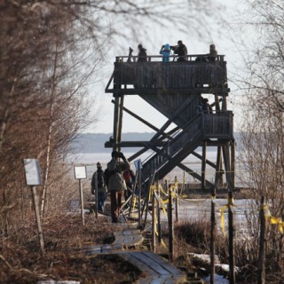 Murron kautta jatkoimme sitten Liminkaan ja Virkkulaan, jossa olikin melkoinen härdelli! Parkkipaikka oli täynnä ja päätien varressakin vielä molemmin puolin 200 metriä autoja parkissa! Onneksi pääsimme kuitenkin lopulta parkkipaikalle. Ohjelmassa oli juuri sopivasti ruokatauko, joten näimme paikalla runsaasti tuttuja. Käytyämme tutustumassa myös häkellyttävän hienoon Lintujen 8 vuodenaikaa näytteluun sekä optiikka- ja kirjamyyntiosastoihin, jutusteltuamme taas lisää tuttujen kanssa ja paistettuamme nuotiolla makkarat, suuntasimme tutustumaan uuteen lintutorniin. Torni oli rakennettu vanhan kojuhökötyksen päälle ja ei ihan ollut yhtä hyvä kuin olisin toivonut. Ainakin näin kovalla tuulella ylätasanne olisi kaivannut kunnon laitoja ja melkoisen tärisevä lattia haittasi kyllä havainnointia. Ja kuten yleensä, Liminganlahdella linnut ovat usein kaukana, niin nytkin. Vesilintuja oli todella runsaasti, muttemme löytäneet niiden joukosta mitään parempaa. 4 merikotkaa ja 22 mustapyrstökuiria jäivät parhaimmiksi havainnoiksi. Opastuskeskuksen viereisellä pellolla suuressa laulujoutsen parvesa oli kaksi pikkujoutsenta.